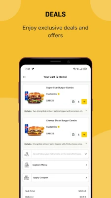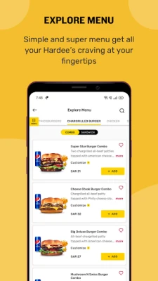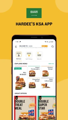 Thực đơn đa dạng của Hardee's sẽ làm hài lòng mọi khẩu vị. Thưởng thức những chiếc Angus Thickburgers® đậm đà, các loại burger gà nướng than thơm lừng, bánh mì kẹp phô mai Philly và burger phi lê hấp dẫn. Hoàn thiện bữa ăn với tuyển chọn các món ăn kèm, món tráng miệng và đồ uống đa dạng, cùng các suất ăn dành cho trẻ em phong phú. Để thêm phần tiện lợi, bạn có thể chọn thanh toán trực tuyến hoặc bằng tiền mặt khi nhận hàng. Hiện tại, dịch vụ đặt món qua ứng dụng được áp dụng dành riêng cho cư dân sống tại Vương quốc Ả Rập Xê Út.