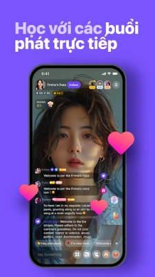 Điều khiến HelloTalk trở nên khác biệt chính là cộng đồng học tập sống động và các tính năng tương tác chuyên sâu. Hãy khám phá các Phòng Thoại, nơi bạn có thể tham gia thảo luận theo nhóm với những người cùng học và người bản xứ về vô vàn chủ đề thú vị, từ đó xây dựng sự tự tin và khả năng biểu đạt tự nhiên. Bên cạnh đó, các buổi Livestream toàn cầu do những chủ phòng được tuyển chọn kỹ lưỡng sẽ mang đến những bài học video trực tuyến, chia sẻ kiến thức ngôn ngữ và cái nhìn sâu sắc về văn hóa bản địa. Bạn còn có cơ hội trò chuyện trực tiếp một-một với các chủ phòng, nhận được hướng dẫn tận tình để cải thiện phát âm, tốc độ nói và vượt qua mọi sự e dè.